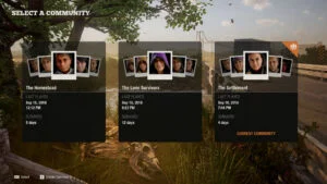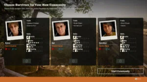 Quando você começar uma comunidade, após ter fechado com sucesso o jogo pelo menos uma vez, haverá a possibilidade de usar os mesmos personagens anteriores ou gerar aleatoriamente outros, conforme imagem mostrada nesta seção. Eu particularmente tento colocar um personagem com habilidade de construção, um com habilidade de serviços públicos ou jardinagem e um médico logo de cara, com traços bons ou neutros de personalidade. Você pode ver os traços neste link: http://state-of-decay-2.wikia.com/wiki/Traits.